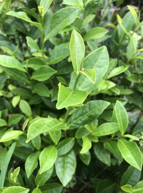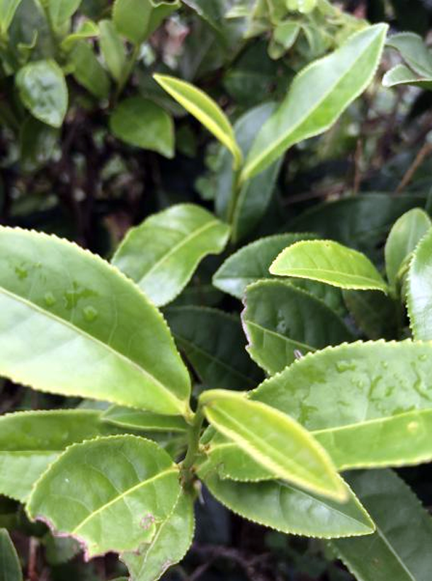 【性狀特征】無性系,小喬木,中葉類,中芽種。該品種樹姿直立,分枝密度中等。葉片上斜著生,葉片長(zhǎng)7.7~10.6cm,葉寬2.9~4.2cm,葉長(zhǎng)橢圓形,葉色綠且有光澤,葉尖銳尖,葉肉厚而微隆,葉面平,葉脈9~10對(duì),葉齒淺密。